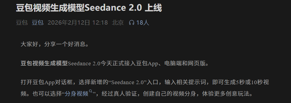 【CNMO科技消息】2月12日,豆包官方宣布,旗下视频生成模型Seedance 2.0正式完成全端接入,同步登陆豆包App、电脑端及网页版,为用户带来全新的AI视频创作体验,真正实现“一句话成片”的创意表达需求。